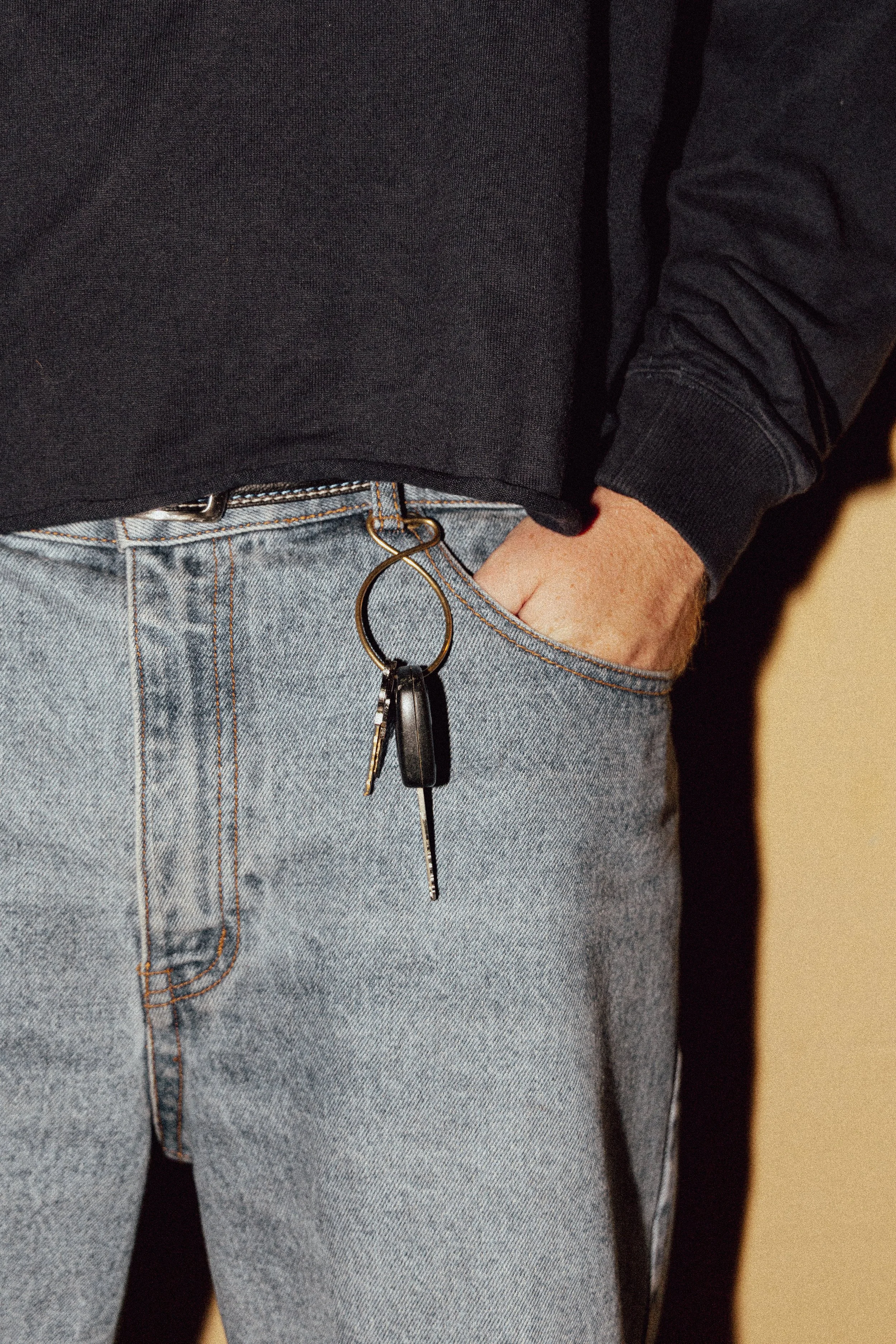 Ollie wearing an infinity spring keychain, hooked to his belt loop.